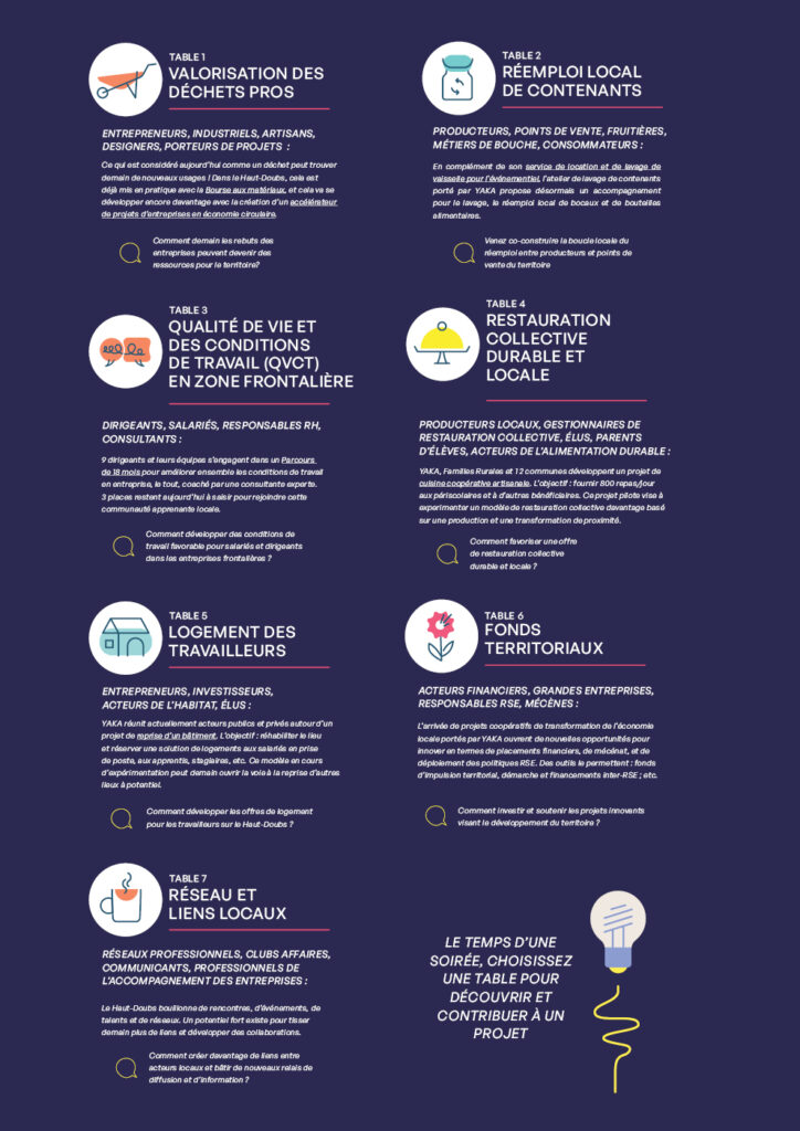- 19h50 : Ouverture des 7 tables thématiques : repas et échanges entre participants sur un sujet à enjeu.